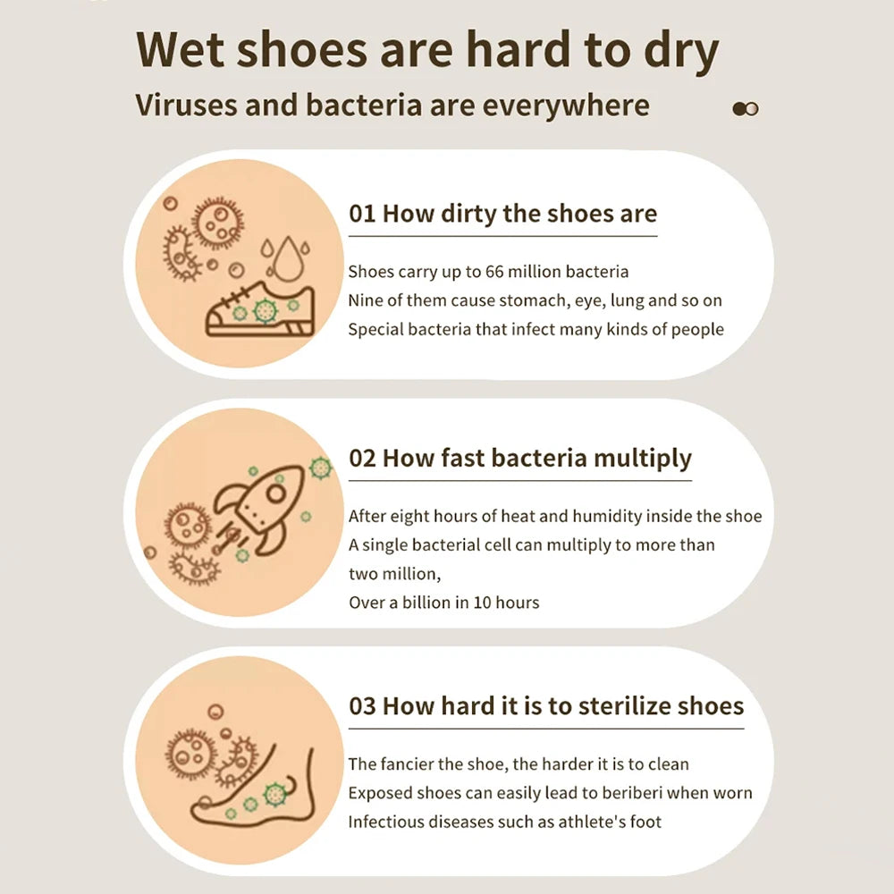 In cold, damp winters, CozyDry keeps your shoes warm and dry, protecting your feet from chill and discomfort. It not only dries but also deodorizes, ensuring your shoes remain fresh and bacteria-free. A must-have for families, ensuring everyone steps out in comfort and style, regardless of the weather.